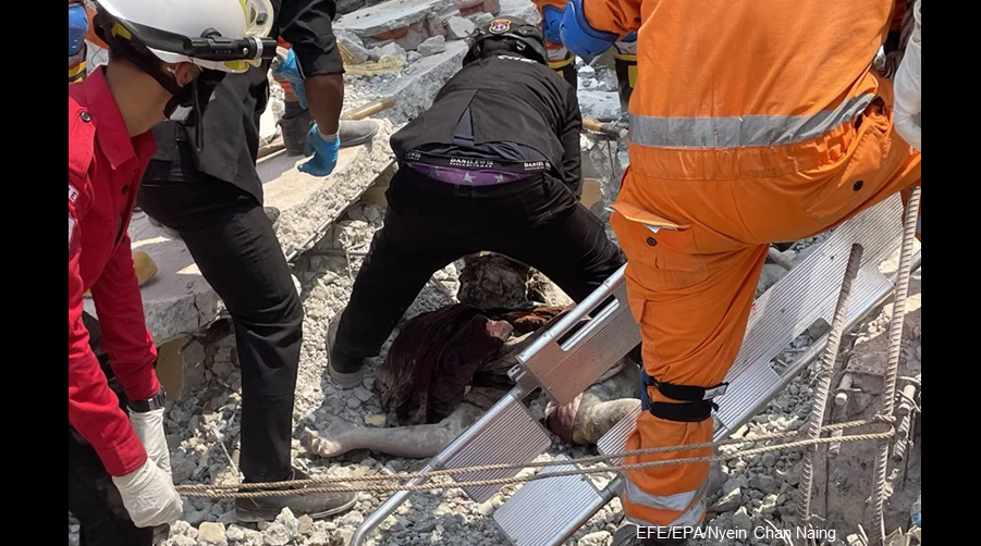 El régimen castrense, que detenta el poder desde el golpe militar de 2021, dijo este lunes a través del canal de radio y televisión MRTV, bajo control militar, que un equipo chino rescató hoy a un niño de cinco años, a una mujer embarazada y a otra de 29 años de un edificio en ruinas en Mandalay, la segunda mayor ciudad del país.