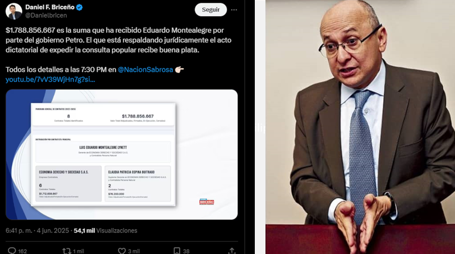 Por su parte el concejal Daniel Briceño, en las últimas horas escribió en su cuenta de X: $1.788.856.667 es la suma que ha recibido Eduardo Montealegre por parte del gobierno Petro. El que está respaldando jurídicamente el acto dictatorial de expedir la consulta popular recibe buena plata, denunció el concejal Briceño.