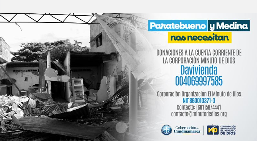 En respuesta a la emergencia humanitaria que dejó el sismo del pasado 8 de junio en los municipios de Paratebueno y Medina, la Gobernación de Cundinamarca, en alianza con la Corporación El Minuto de Dios, lanzó una campaña de donaciones dirigida a ciudadanos y empresas para apoyar la reconstrucción de viviendas y escuelas rurales afectadas.