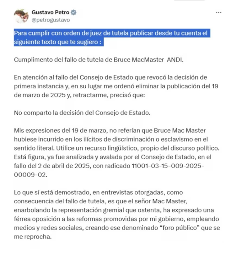 Como se sabe, Gustavo Petro tenía que cumplir una orden del Consejo de Estado, que le ordenó retractarse sobre un trino en el que lanzaba acusaciones contra la Andi (Asociación Nacional de Industriales) y su presidente Bruce Mac Master.