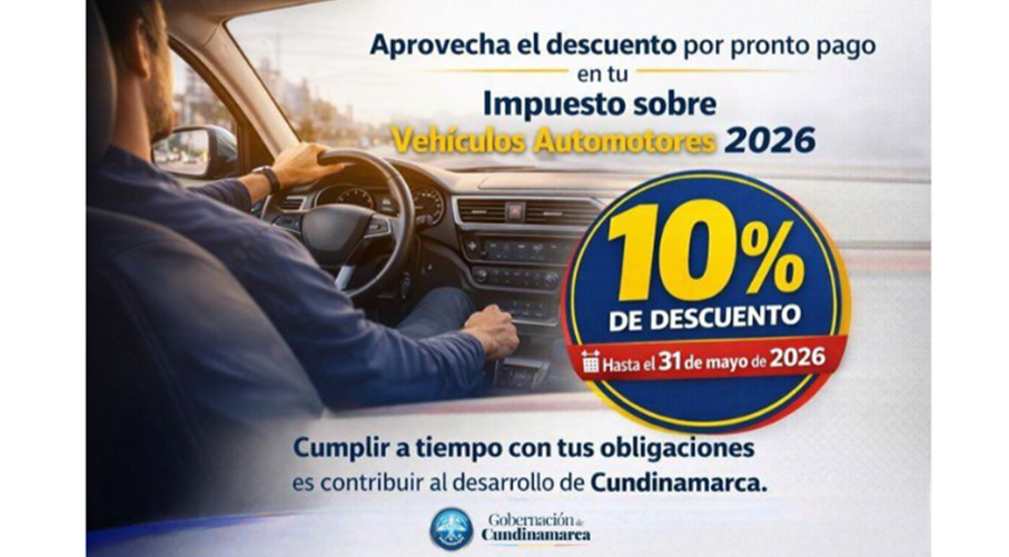 HASTA 10 % DE DESCUENTO: CUNDINAMARCA ABRE CALENDARIO 2026 DEL IMPUESTO VEHICULAR CON BENEFICIOS POR PRONTO PAGO